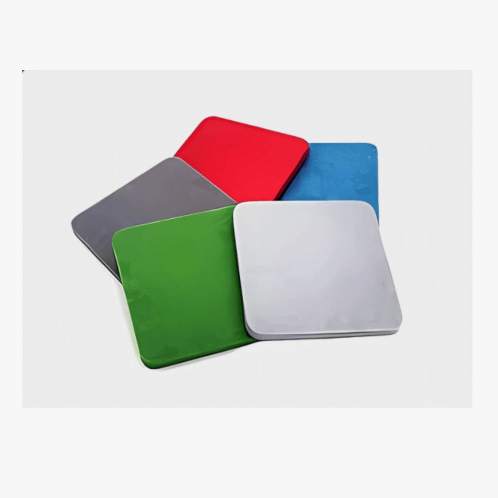 Lightweight, ultra-thin synthetic ceiling panels with vibrant colours, prints, and effective T-grid acoustic performance.